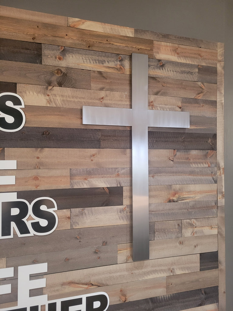 Each piece is expertly crafted in the USA using durable 16-gauge cold-rolled steel and features a hand-polished, brushed stainless steel look. Designed with precision using CNC fabrication, the cross is then finished with a high-gloss, clear protective coating to ensure it remains beautiful for years to come—indoors or out. Message us for a custom size request.